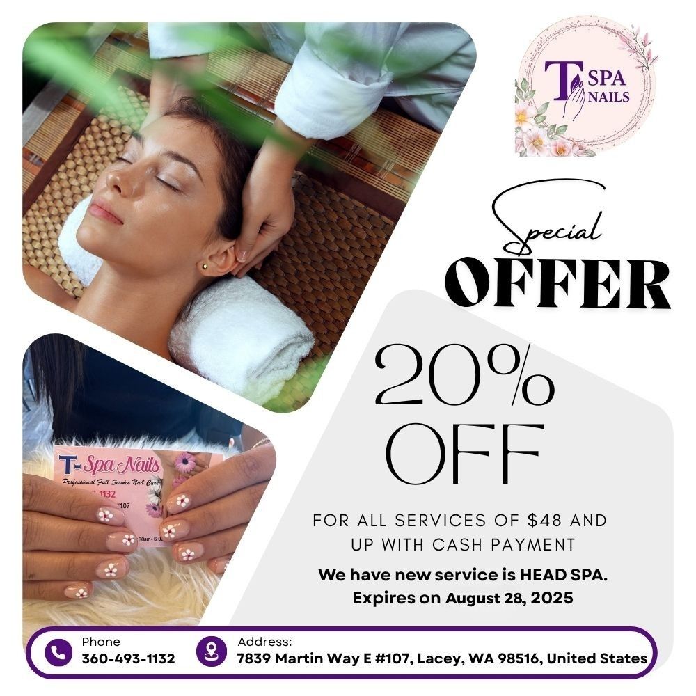 Welcome to T Spa Nails — where beauty meets relaxation. We take pride in combining top-quality products with skilled techniques to deliver exceptional nail care and spa services. Whether you're here for a quick touch-up or a full pampering session, we aim to be your go-to destination for rejuvenation and style.
